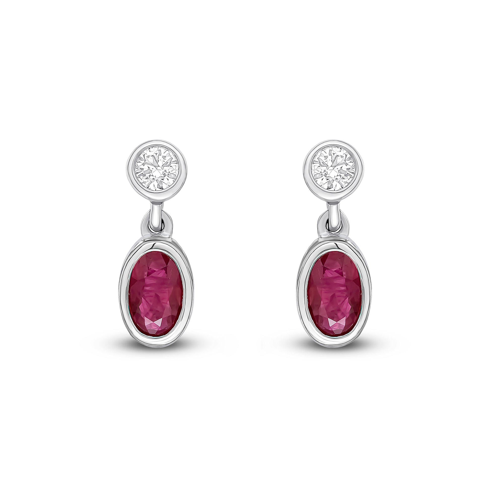 These 18ct white gold ruby and diamond earrings are beautifully crafted, featuring two oval rubies surrounded by a border of sparkling diamonds. The 18ct white gold setting makes them a luxurious addition to any outfit.