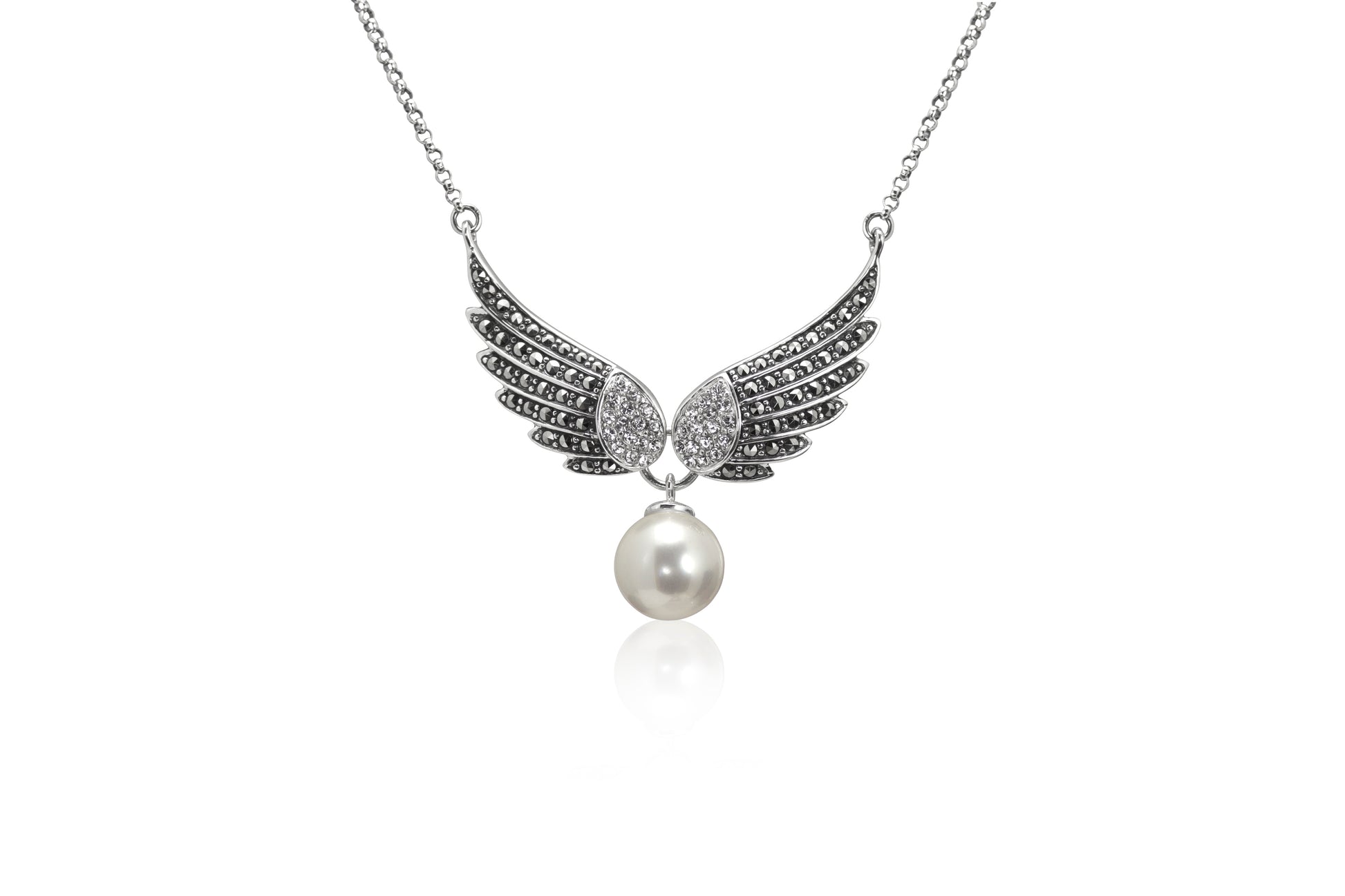 silver pearl and cz wing necklace