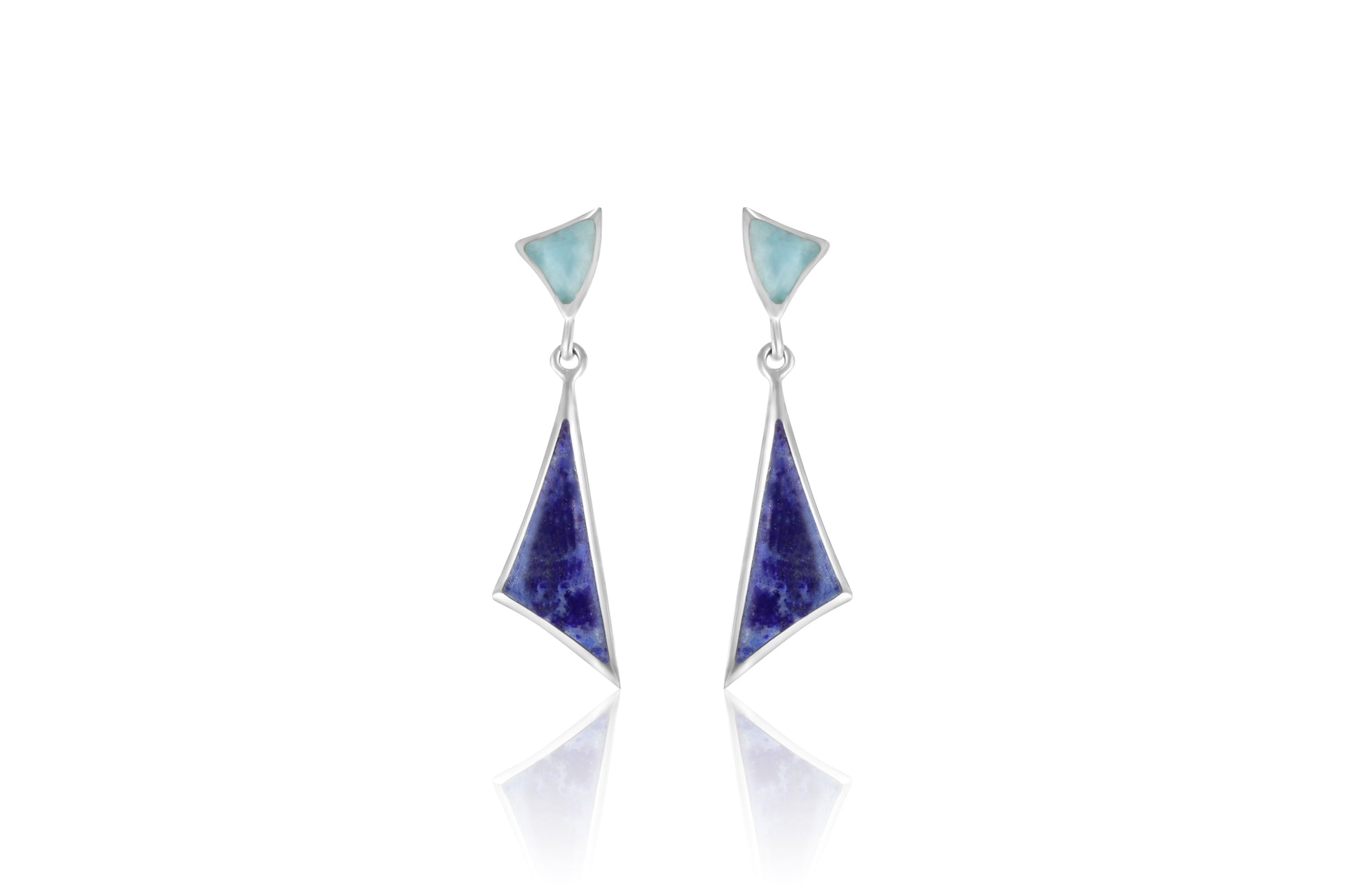 These earrings are made from sterling silver and feature triangular drops of larimar and lapis. The classic combination of colours and styles makes for a sophisticated, elegant look.